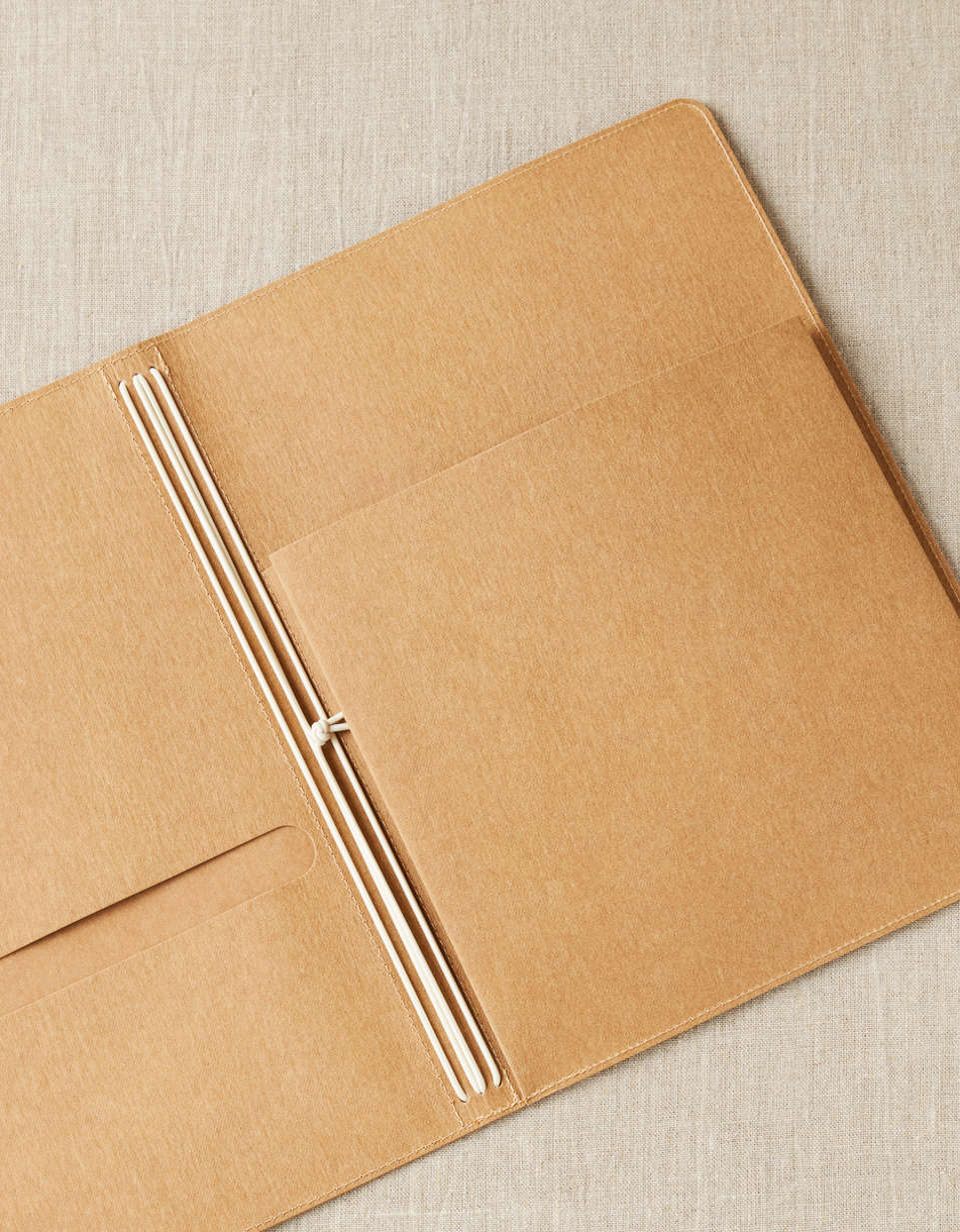 Neatly contain loose-leaf papers, journals, books, and tablets all together. This minimalist portfolio folder is made from washable kraft paper fabric, and is great for both knitting and non-knitting projects. The portfolio is held closed with elastic and the interior spine elastics can hold magazines, books, a Maker’s Board and folded papers. There are two interior pockets including an accordion pocket which is handy for stashing papers and other loose items. Extra elastics are included in four colors, so you can switch out the ivory elastic if you want a splash of color.