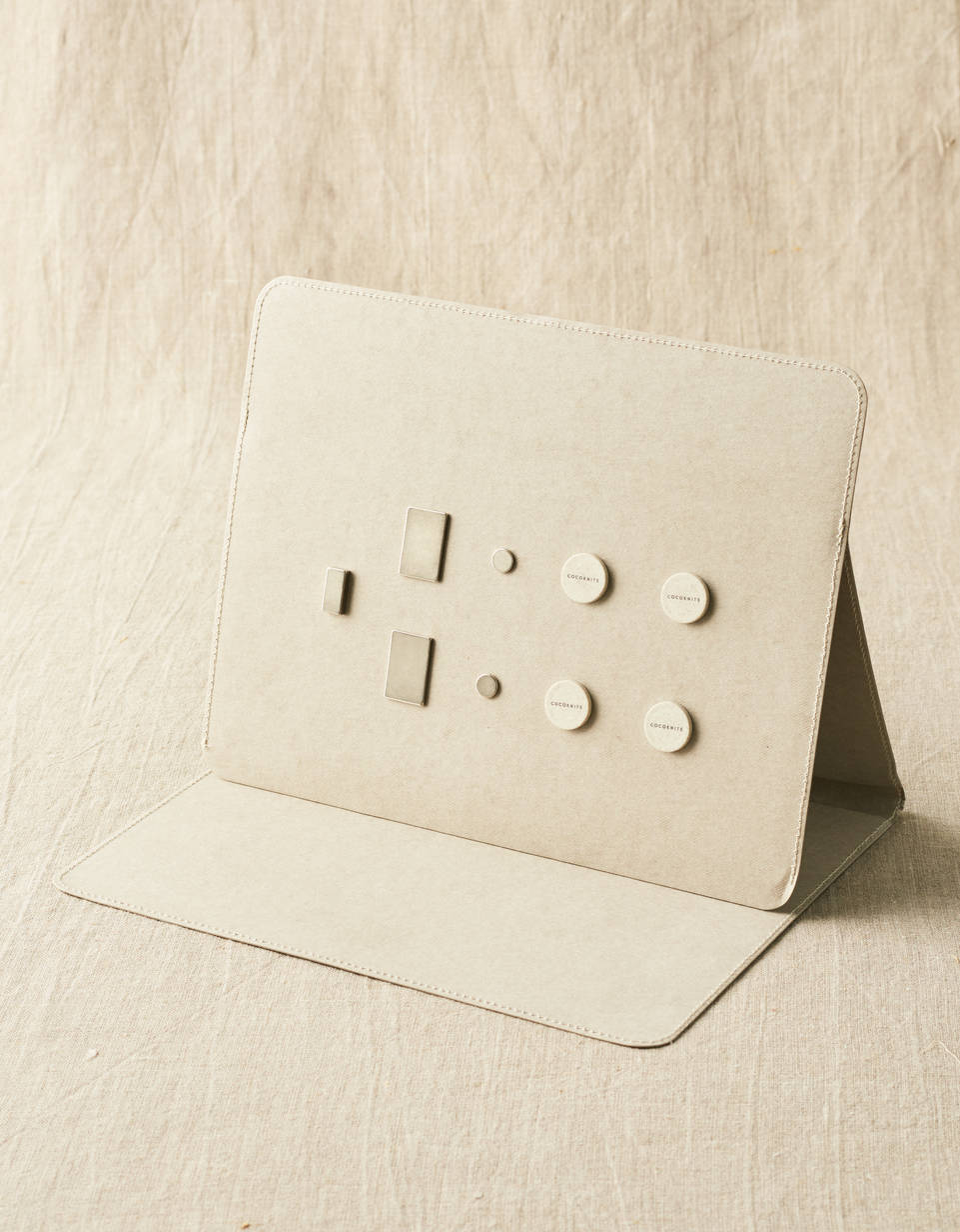 The Maker's Board Kit by Cocoknits provides a convenient way to follow charts, patterns, recipes, and more. The strong, small magnets hold papers and small tools against the internal metal sheets, and keep project instruction at hand while working. Inner pockets store all of your papers together in one place.