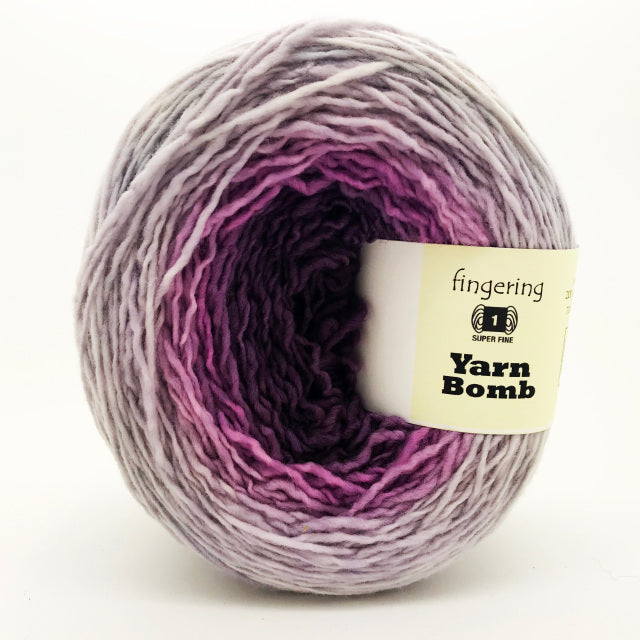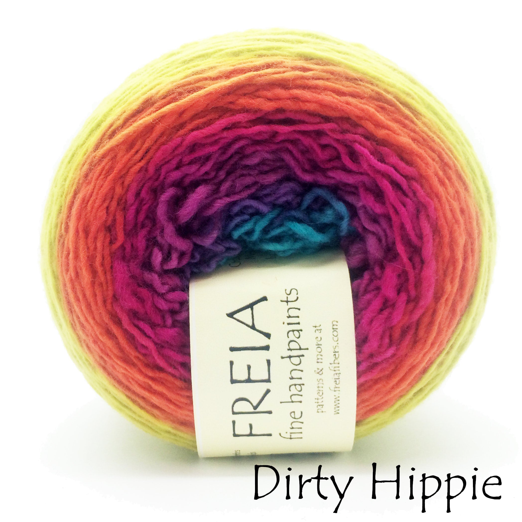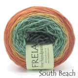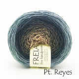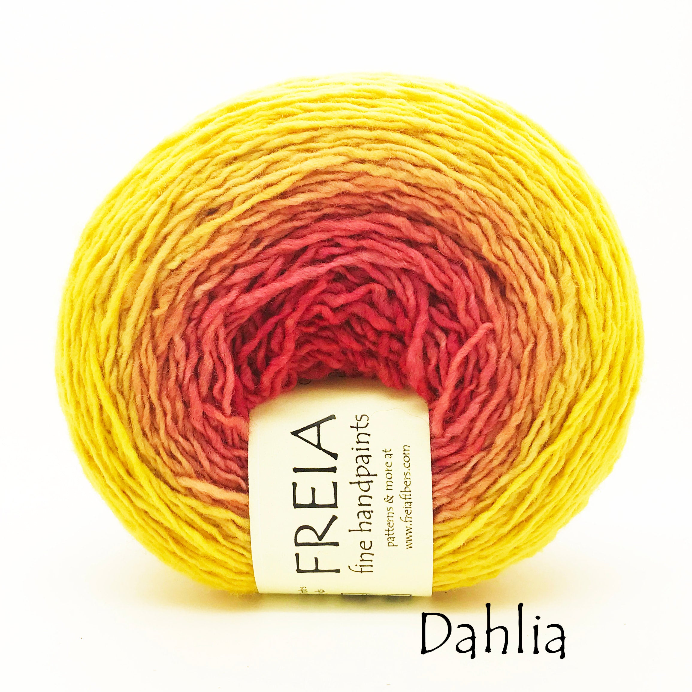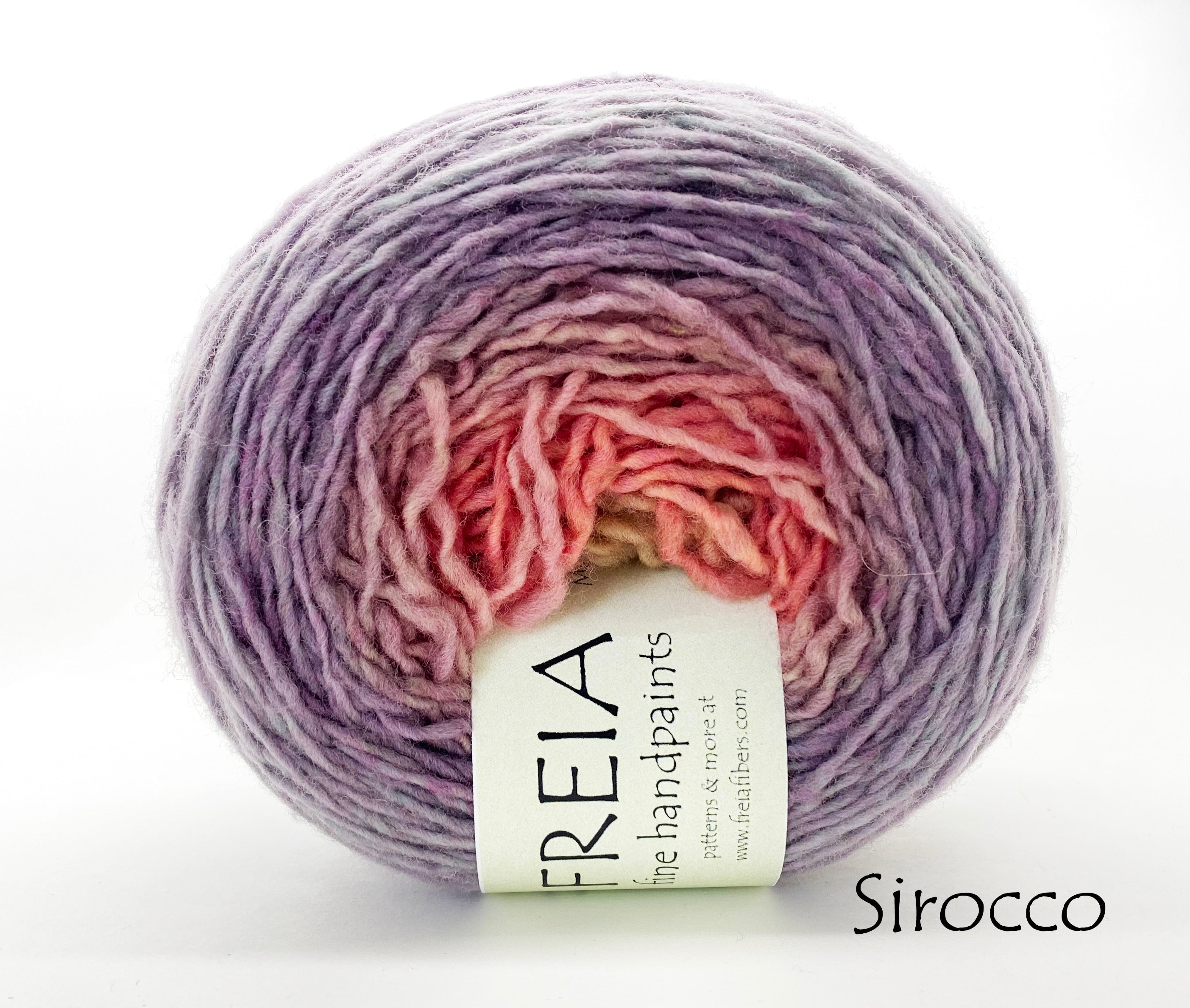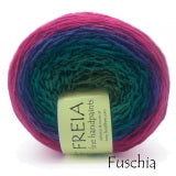 Freia Fibers hand-dyes their gradient yarn with inventive color combinations. The fibers are soft and these shawl balls, are weight 1, enabling a lot of time for color interplay.