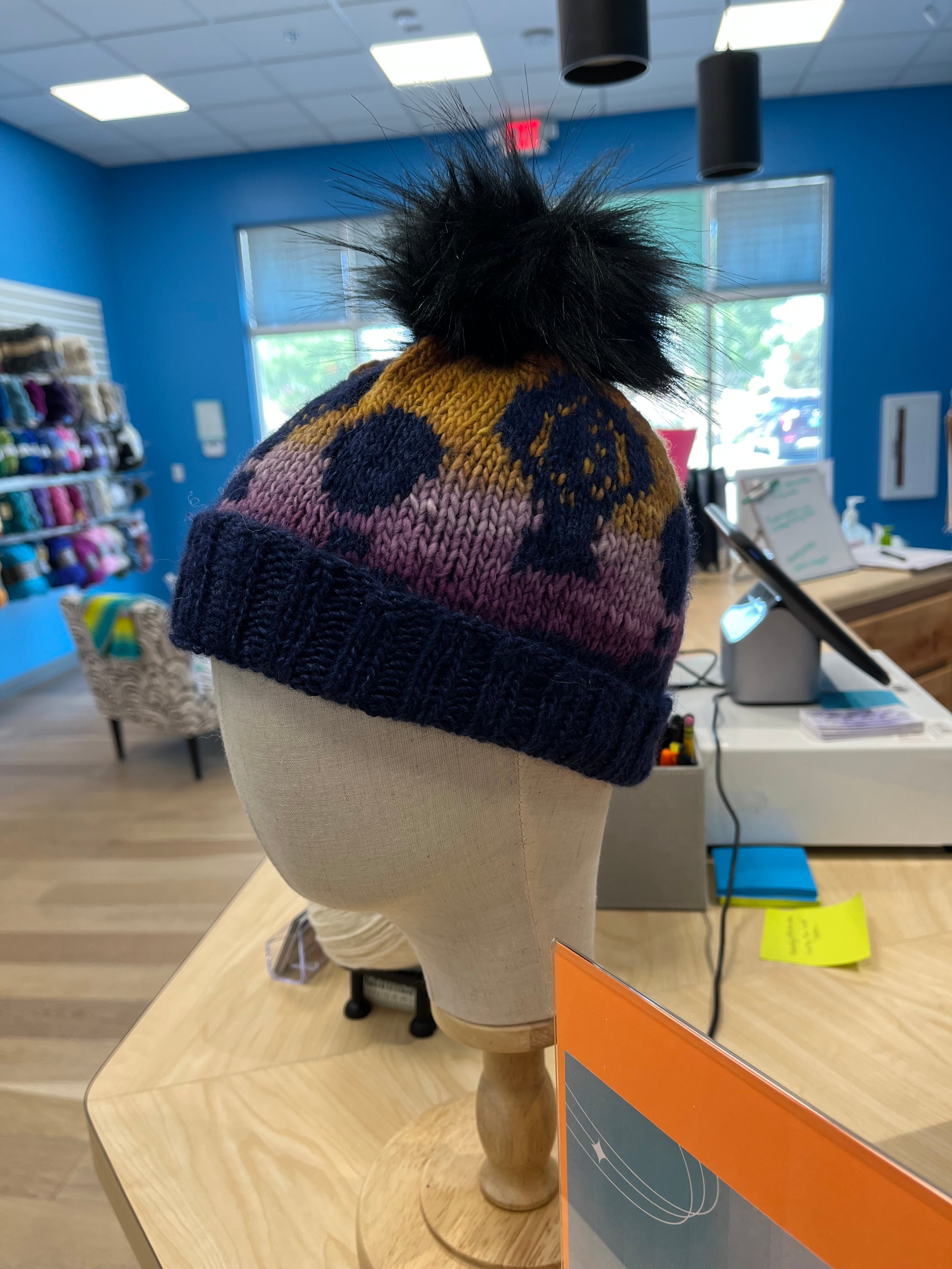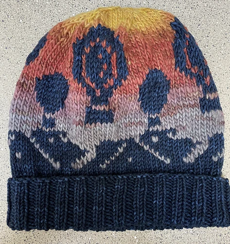 This hat delivers the "enchanting magic of flight" writes designer Whitney Terrell. She uses a simple color work pattern with a background of color from Freia Fibers worsted.