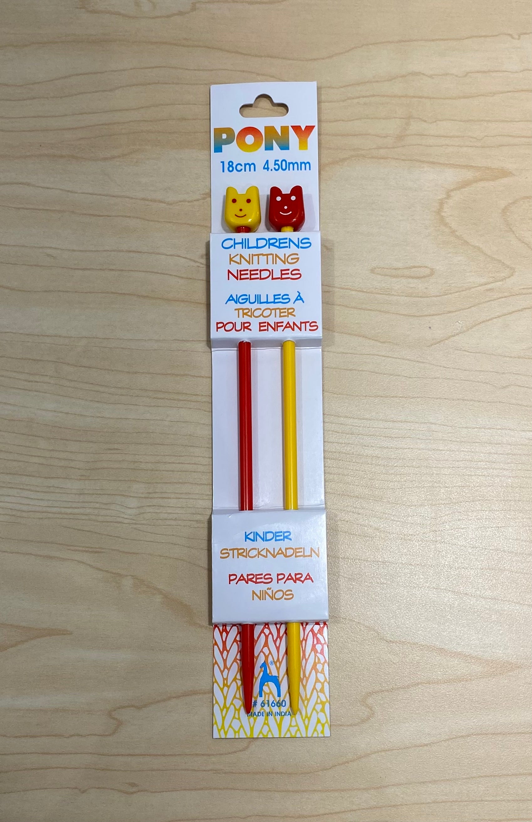 The perfect set of beginner knitting needles for any child. They are 7 in/18cm long and US 7/4.5mm in size. Two colors of knitting needles make fore easy learning.
